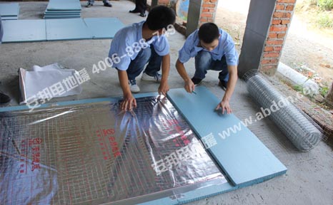 施工材料:安邦單導發(fā)熱電纜,型號ABV01173100 TXLP/1/17;智能溫度控制器;地暖感溫探頭;地暖專用保溫板;地暖專用反射膜;鋼絲網(wǎng)等。