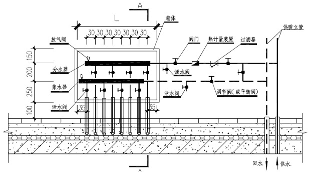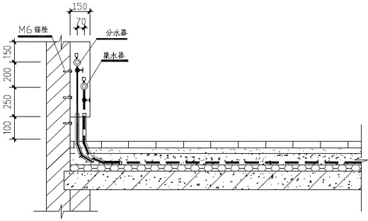 5.3.12 分水器、集水器在開始鋪設加熱管之前安裝的目的是保證柔性加熱管精確轉向和通入分水器、集水器內(nèi)。分水器、集水器安裝示意圖如圖8所示。