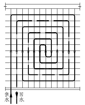 3.5.3 加熱管采取不同布置形式時,導致的地面溫度分布是不同的。布管時,應本著保證地面溫度均勻的原則進行,宜將高溫管段優(yōu)先布置于外窗、外墻側,使室內(nèi)溫度分布盡可能均勻。加熱管的布置形式很多,通常有以下幾種形式,如圖3~圖7 所示。